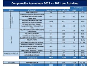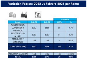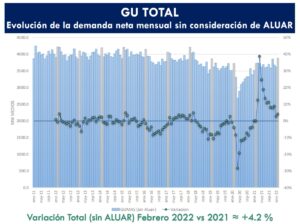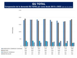 INTRODUCCIÓN En el presente trabajo se encuentra analizado el consumo de la gran demanda mayor, GU(Grandes Usuarios) TOTAL, clasificados por rama y actividad de acuerdo a su producción o servicio que prestan, desde Enero 2011 a la fecha. Partiendo de una base de algo más de 7500 empresas entre GUMAs, GUMEs y GUDIs, que representan aprox. el 98% de la gran demanda mayor a nivel país, se analiza la evolución de la demanda durante los ultimo años. El informe contiene un análisis de la demanda total, centrado en el mes de análisis, Febrero 2022, detallando el comportamiento de la demanda clasificada por rama y actividad. CONCLUSIONES GU TOTAL En el mes de Febrero 2022 se observa un incremento de la demanda GU en el orden de 4.2% sin Aluar (incluyendo a Aluar: 0.9%). Prácticamente sin restricciones en Febrero 2021 que se definieron al decretarse el aislamiento social, preventivo y obligatorio en Marzo 2020, al comparar la demanda de los grandes usuarios en este año se observa un incremento “moderado. El principal indicador sobre el recupero en la demanda se observa si miramos la demanda en Febrero 2020 y Febrero 2019, y la comparamos con la demanda de este año => se observa que la demanda en este año es similar en ambos casos. El mayor incremento de la demanda respecto al mismo periodo del año anterior se registra en las actividades relacionadas con la rama INDUSTRIAL, que justamente son aquellas en donde hoy presentan un mayor recupero de la demanda en relación a la primera semana de cuarentena, prácticamente hoy con una demanda similar, e incluso superior, a la demanda del año anterior