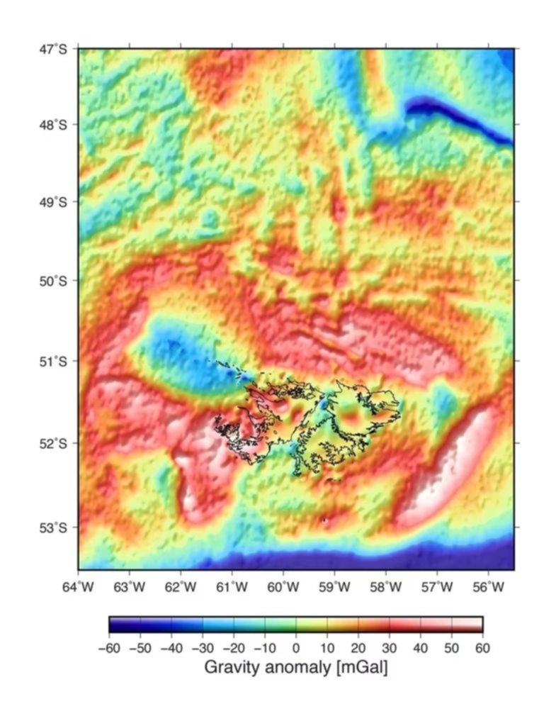 “Nadie parecía haberse hecho eco de ese trabajo. Decidí que yo sería la persona que investigaría a fondo ese lugar”, dijo Rocca en una extensa nota dada a Infobae, en donde despliega una pequeña parte de su investigación. Lo primero que encontró fue un mapa de anomalías gravimétricas de Malvinas del Servicio Geológico Minero de Argentina (SEGEMAR) que databa de 1997. Mostraba una tremenda estructura circular al noroeste de Gran Malvinas, exactamente al lado de las islas.