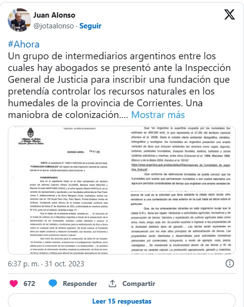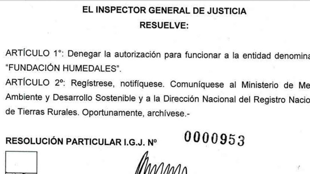 Según la resolución a la que tuvo acceso Tiempo, el organismo encargado de inscribir y fiscalizar a las sociedades comerciales y entidades civiles en la Argentina consideró que la presentación de los planes de inversión y de negocios de la Fundación Humedales «sólo arroja un manto de dudas acerca del fin último de los fundadores para con la entidad bajo juicio, lo que lleva a interrogarse acerca de que si lo que en realidad se pretende, a través de la figura de una fundación constituida en el país, es sortear las limitaciones que la Ley 26.737 y su decreto reglamentario imponen a los extranjeros para la adquisición de tierras rurales, en especial las prohibiciones de poder ser titulares o poseer inmuebles que contengan o sean ribereños de cuerpos de agua de envergadura y permanentes como lo serían los humedales».