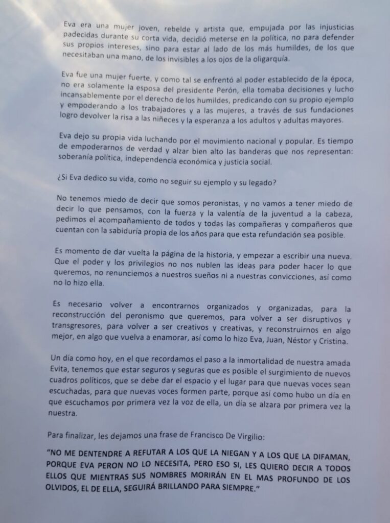 Seguidamente hizo uso de la palabra la representante de la Juventud Peronista del Partido de la Costa Luz Savastano, quien leyó el siguiente documento.