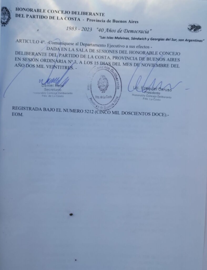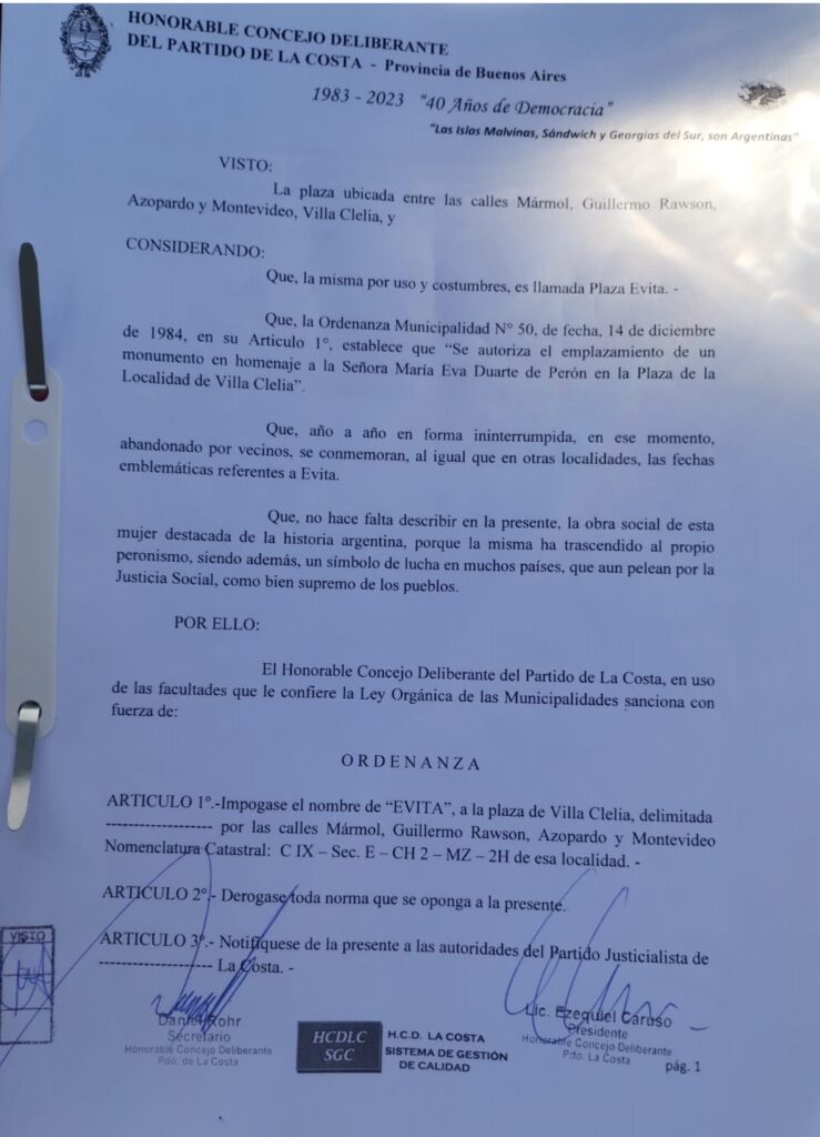 Se formalizó institucionalmente la imposición del Nombre Evita Perón a la Plazoleta de Azopardo y Marmol, de la localidad de Mar de Ajó, Partido de la Costa, V Sección Electoral, Provincia de Buenos Aires.