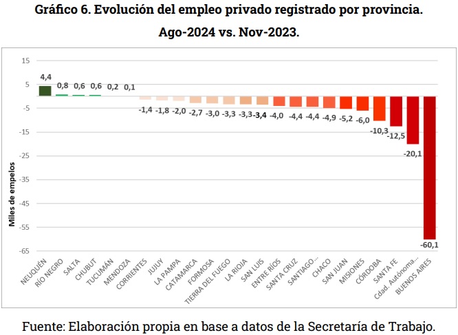 A nivel provincial, la caída del empleo se concentra en las ciudades más grandes: Buenos Aires (-60 mil), CABA (-20 mil), Santa Fe (-12 mil) y Córdoba (-10 mil); mientras que las provincias en donde se concentra la actividad minera e hidrocarburífera (Neuqén, Río Negro, Salta y Chubut), generaron casi 6,5 mil puestos de trabajo registrado nuevos (Gráfico 6).