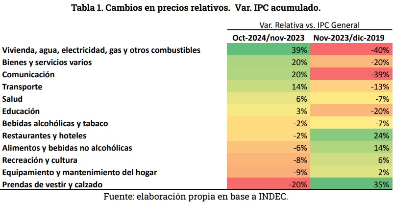 En sólo 11 meses del gobierno de Milei, a partir de la desregulación de muchos sectores económicos, la eliminación de subsidios y la dolarización de las tarifas, gran parte de esos cambios ya fueron revertidos. Tarifas de servicios públicos, combustibles y transporte ya recuperaron lo perdido. Servicios de comunicación recuperó un 50%. En el otro extremo, Prendas de Vestir y Calzado perdió gran parte de lo ganado durante el gobierno anterior. Situación análoga a la de los precios de Alimentos y Bebidas.