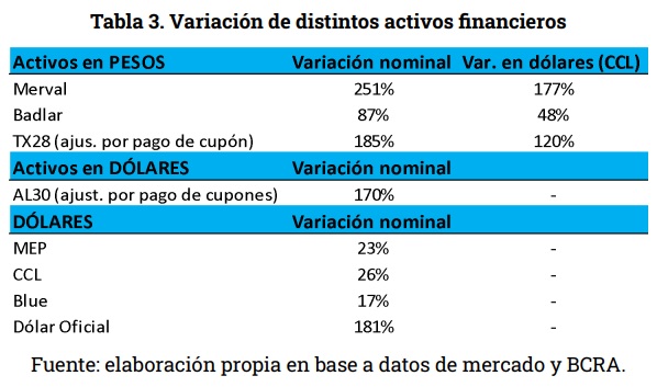También fue dispar la evolución de la riqueza implícita en los distintos activos financieros Los grandes ganadores han sido el Merval y los BONARES (AL30 como referencia). El Índice Merval tuvo un aumento nominal de 251% en el primer año de Milei, lo que sumado al proceso de apreciación cambiaria —especialmente si consideramos los dólares financieros arroja una rentabilidad en dólares de 177%. El AL30, por su parte, obtuvo una rentabilidad de 170%.