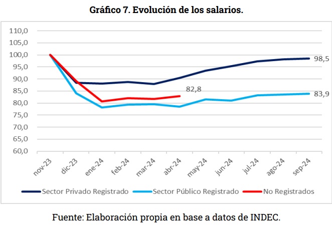 A nivel ingresos también observamos una gran disparidad. Como dijimos en el informe de coyuntura anterior, la recuperación salarial es parcial y muy heterogénea. Mientras que los salarios del sector privado registrado se encuentran casi al mismo nivel que noviembre de 2023 (-1,5 p.p), los salarios del sector público sufren una caída de más de 16 p.p. Incluso dentro del universo de trabajadores registrados del sector privado se observa gran heterogeneidad entre ramas. También entre el universo de trabajadores registrados y no registrados.