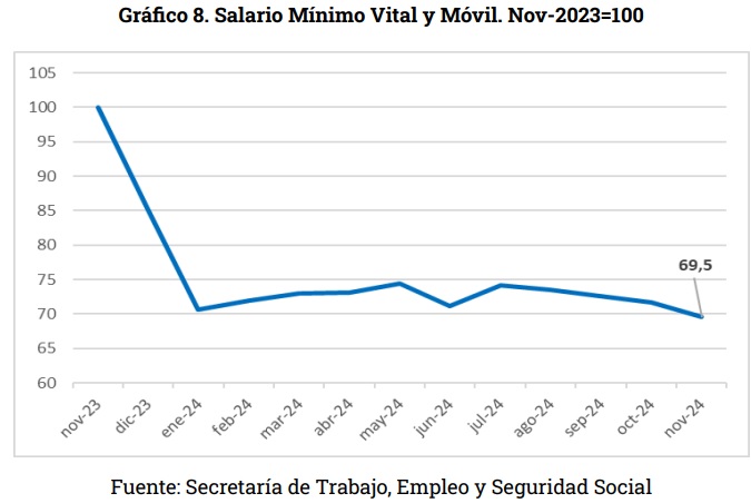 Para la trayectoria de los ingresos del sector privado no registrado —aproximadamente un cuarto del total de trabajadores— los datos que publica el INDEC muestran una caída acumulada de casi 18 puntos respecto a noviembre-2023. No obstante, atento que los ingresos de este sector se publican con 5 meses de rezago, el último dato corresponde a lo ocurrido con estos salarios en abril 2024. Si en cambio observamos la evolución del Salario Mínimo Vital y Móvil (Gráfico 3), indicador que es una referencia para algunos salarios de los trabajadores informales, la pérdida de poder adquisitivo alcanza a noviembre de 2024 casi el 30%.