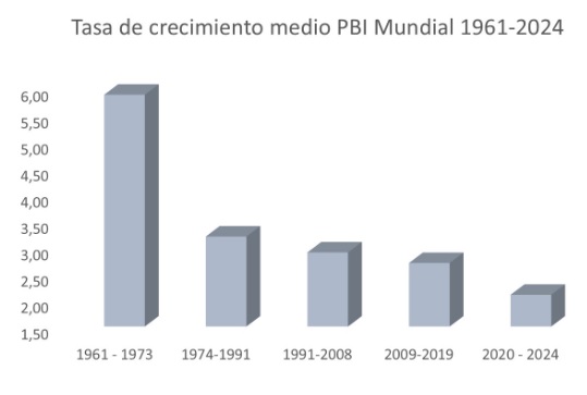 En el ámbito económico, la situación no es más alentadora. Aunque compartimos un mismo planeta, las realidades económicas son drásticamente distintas. Por ejemplo, desde los años sesenta, la tasa promedio de crecimiento de la economía global ha disminuido de forma constante. En el gráfico se muestra la esperanza de un modelo económico «cincuenta y cincuenta» en la década de los setenta; sin embargo, a partir de entonces, la tasa de crecimiento se redujo a menos del 50%.