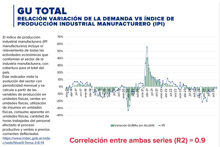 Hay una relación directa entre la demanda de Grandes Usuarios del MEM (GU) registrada por la Compañía Argentina del Mercado Mayorista Eléctrico S.A. (CAMMESA) y el Índice de Producción Industrial manufacturero (IPI manufacturero). Este último incluye el relevamiento de todas las actividades económicas que conforman el sector de la industria manufacturera, con cobertura para el total del país.