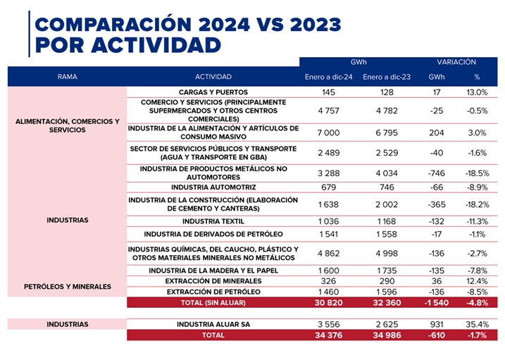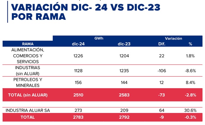 A continuación, se puede apreciar la comparación con diciembre del año pasado de las distintas ramas que componen los Grandes Usuarios
