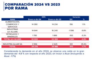 Si queremos analizar la situación del año 2024 completo respecto al total del año anterior (2023) veremos que también la demanda de electricidad ha sido inferior en todos los sectores con la excepción del sector de alimentación comercios y servicios.