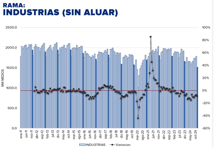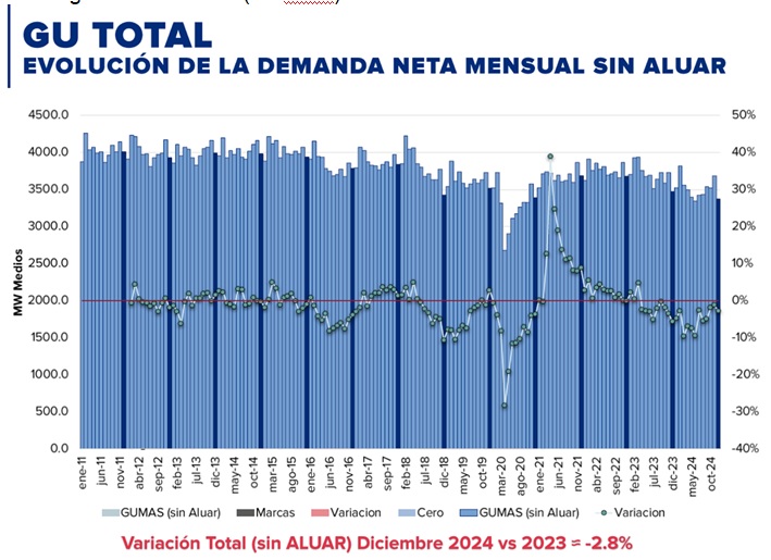Al igual a lo que se viene observando en los últimos meses, en el mes de diciembre de 2024, la demanda de GU (sin incluir a Aluar), presento una variación de -2,8 % respecto a el mismo mes del año 2023. En la industria la disminución fue del 8,6 %, en este mes con el agravante de que fue sobre valores del año pasado ya deprimidos.