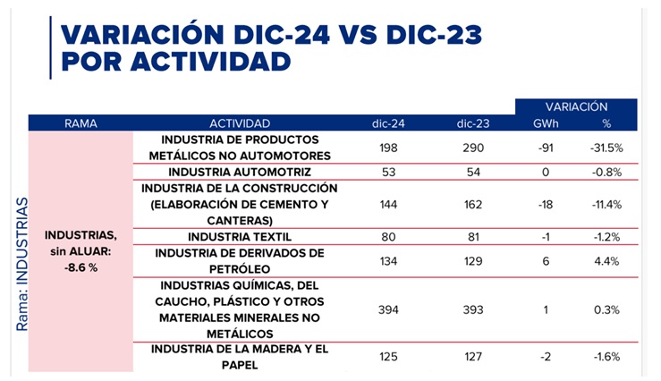 A continuación, se puede apreciar la demanda de energía eléctrica de distintas ramas de la industria en diciembre del año 2024 y su variación respecto al mismo mes del año 2023.