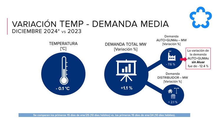Además, en la comparación de los primeros quince días del mes de enero de este año con los primeros quince días de enero del año 2024 esto no ha cambiado y la disminución en la demanda de electricidad de los GU se mantiene