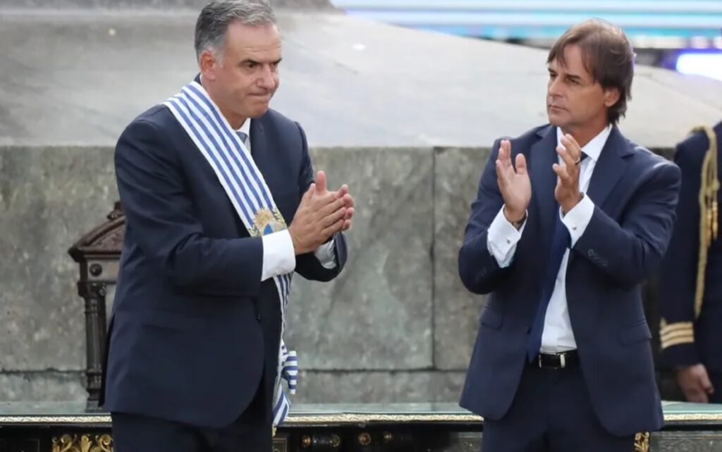 El nuevo presidente de Uruguay, Yamandú Orsi (i), recibe aplausos junto al saliente presidente de Uruguay, Luis Lacalle Pou, en la ceremonia de entrega de la Banda Presidencial este sábado, en la Plaza Independencia en Montevideo