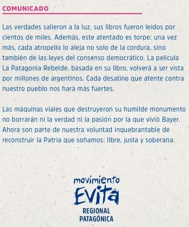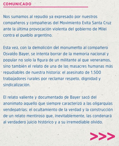 Demolición de Vialidad Nacional del Monumento a Osvaldo Bayer, Comunicado del Movimiento Evita Regional Patagonia by Silvio Bageneta 26/03/2025 | 9:14 0 Posted in Derechos Humanos, Federalismo, Política, Soberanía Nacional Regresar a Diario Mar de Ajó, el diarito – Prensa Popular –Noticias Atemporales- Prensa Alternativa Regresar a Diario Mar de Ajó, el diarito – Prensa Popular –Noticias Atemporales- Prensa Alternativa 233235 305119 Related Posts Damián Luján presidente Cooperativa CONTEX de Las Flores, al servicio de su pueblo Regresar a Diario Mar de Ajó, el diarito – Prensa Popular –Noticias Atemporales- Prensa ARGENTINA COMUNIDAD SILVESTRE: «Intentemos ser cada día más solidarios, comprensivos, humanos» Regresar a Diario Mar de Ajó, el diarito – Prensa Popular –Noticias Atemporales- Prensa Leave a Reply