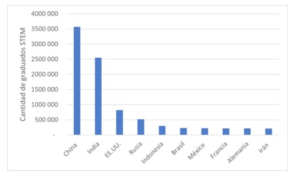 Figura 2. Graduados STEM por países (10 primeros). Fuente: elaboración propia en base a datos de Oliss et al. (2023).