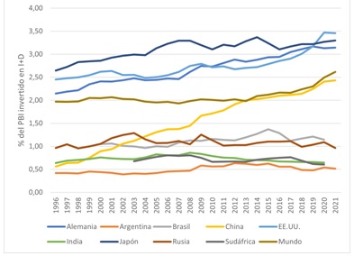 Por otro lado, los países de los BRICS representan una parte importante del gasto global en investigación y desarrollo, aunque se ve una profunda disparidad entre sus miembros. Según datos de la UNESCO (2021) y el Banco Mundial (2022), mientras China invierte en I+D alrededor del 2,4% de su PIB (es el segundo en números absolutos a nivel mundial y el primero si se mide a precios de poder adquisitivo), Rusia y Brasil invierten aproximadamente alrededor del 1% de su PIB en I+D (1,09% y 1,15% respectivamente en el año 2020). India (0,65%) y Sudáfrica (0,6%) se encuentran un escalón por debajo, aunque están aumentando su inversión en áreas consideradas estratégicas[1]. En conjunto, los BRICS representan más del 20% del gasto global en I+D, pero la mayor parte lo explica China.