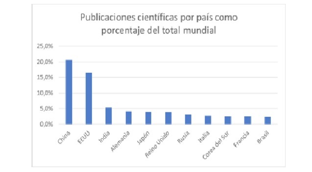 | Figura 1. Publicaciones científicas por país como porcentaje del total mundial. Fuente: elaboración propia en base a datos de National Science Board (2019). |