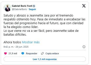 Ante un universo de más de 1 millón 400 mil votos a nivel nacional, Jeannette Jara, la candidata comunista, se convirtió en la representante del oficialismo para las elecciones presidenciales de noviembre luego del proceso eleccionario de primarias legales.
