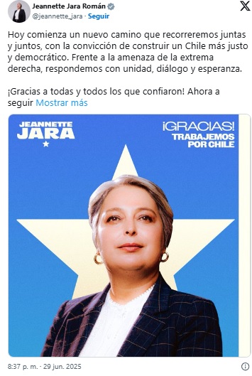 CHILE: Jeannette Jara, representante del Partido 30/06/2025, ganó las elecciones primarias y será candidata presidencial en noviembre