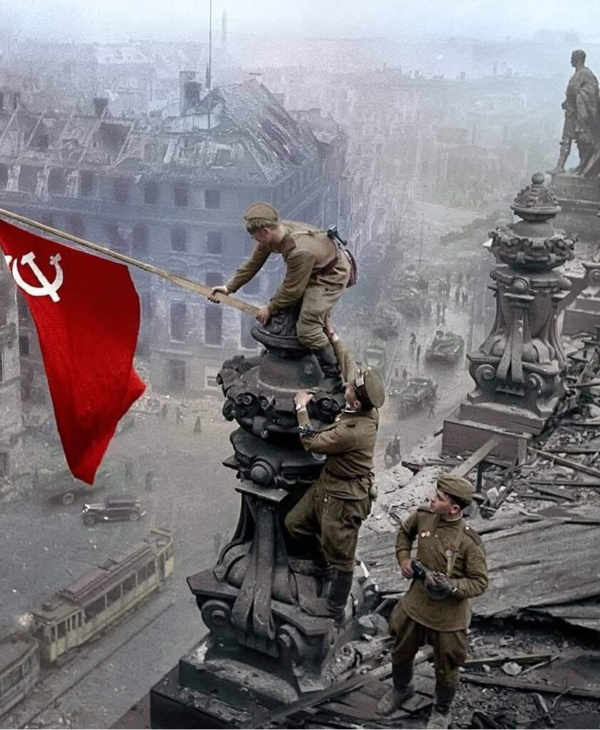 Después de la batalla de Stalingrado, a la cual Otto Vargas, secretario del PCR argentino calificó «la batalla más importante de la historia», el Ejército Rojo derrotó a los nazis, liberó numerosos países europeos, para llegar finalmente a Berlín e izar la bandera roja sobre el Reichtag.