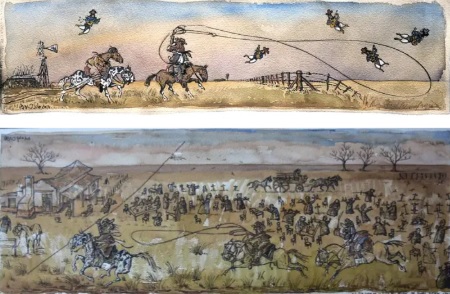 Pero, en rigor, ambos talentos parecen necesitarse y complementarse: “Viajar se convirtió en una parte fundamental de mi trabajo. En moto, a caballo un tiempo, buscando los rastros ranquelinos en los montes pampeanos, en jineteadas, en encuentros de payadores, en eventos populares en los que participo y donde encuentro la temática que luego se convierte en imágenes”, cuenta Solo Díaz. Llamativamente, el artista nació en Larrea y Juncal, pero en el seno de una familia de campesinos emigrados que en su casa tocaban la guitarra y cantaban milongas acompañadas por mucho vino. Tanto sus abuelos como gran parte de sus veinte tíos iban y venían al campo, ya que algunos de ellos trabajaban como mayordomos y llevaban a Pablo durante los veranos. Incluso, el primer juguete que recuerda es un caballito de palo que su madre había encontrado en la calle y restaurado, además del gusto por la literatura y los versos criollos que le inculcó su padre, junto al compromiso político de ambos. Ya en la adolescencia, recuerda perderse entre la gente en los campos de Saladillo, Rauch, Ayacucho, Pehuajó, Trenque Lauquen, 30 de Agosto o Las Flores, para luego de un tiempo, tras “el año muy triste” de la derrota de Malvinas, iniciar con un amigo un viaje a diversos pueblos de Buenos Aires y La Pampa.
